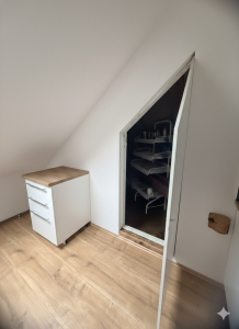Kuchyně s komorou (10 m² + 8 m² ): Samostatná zóna pro vaření, vybavená moderní linkou, varnou deskou a troubou. Obrovskou výhodou je přímo navazující půdní prostor, který skvěle poslouží jako praktická spíž (špajz) nebo menší technická místnost